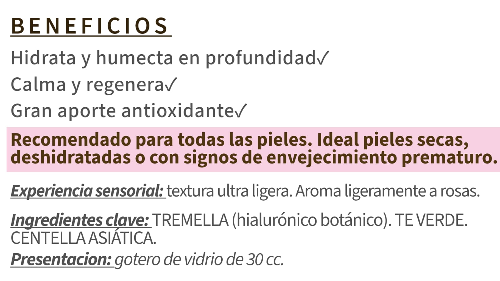 Desde los 25 años, la piel pierde alrededor de un 1% de ácido hialurónico (sustancia que segrega nuestro cuerpo naturalmente) por año por ellos es buena idea sumar un sérum que ayuda a reponer hidratación y a mantener la piel flexible, luminosa y confortable, de ese modo fomentamos una piel más saludable y luminosa.
