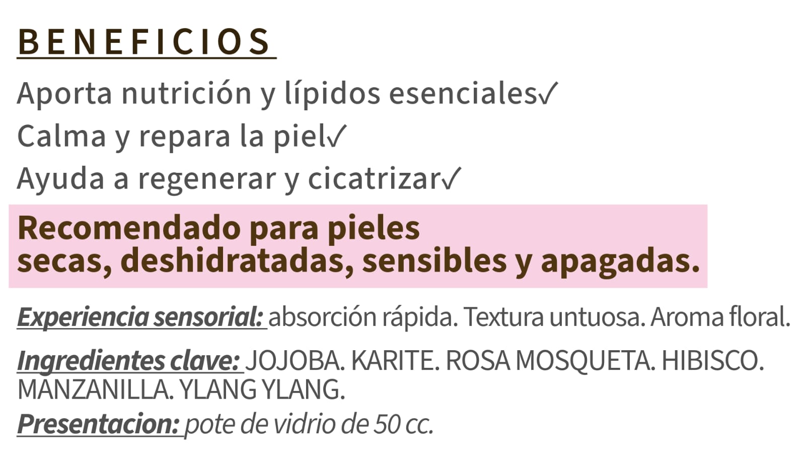 Recomendada para pieles secas, maduras o con signos de envejecimiento prematuro. Si tú piel es grasa pero necesitas una emulsion más nutritiva para los días más fríos o secos podés sumarla a tu rutina.